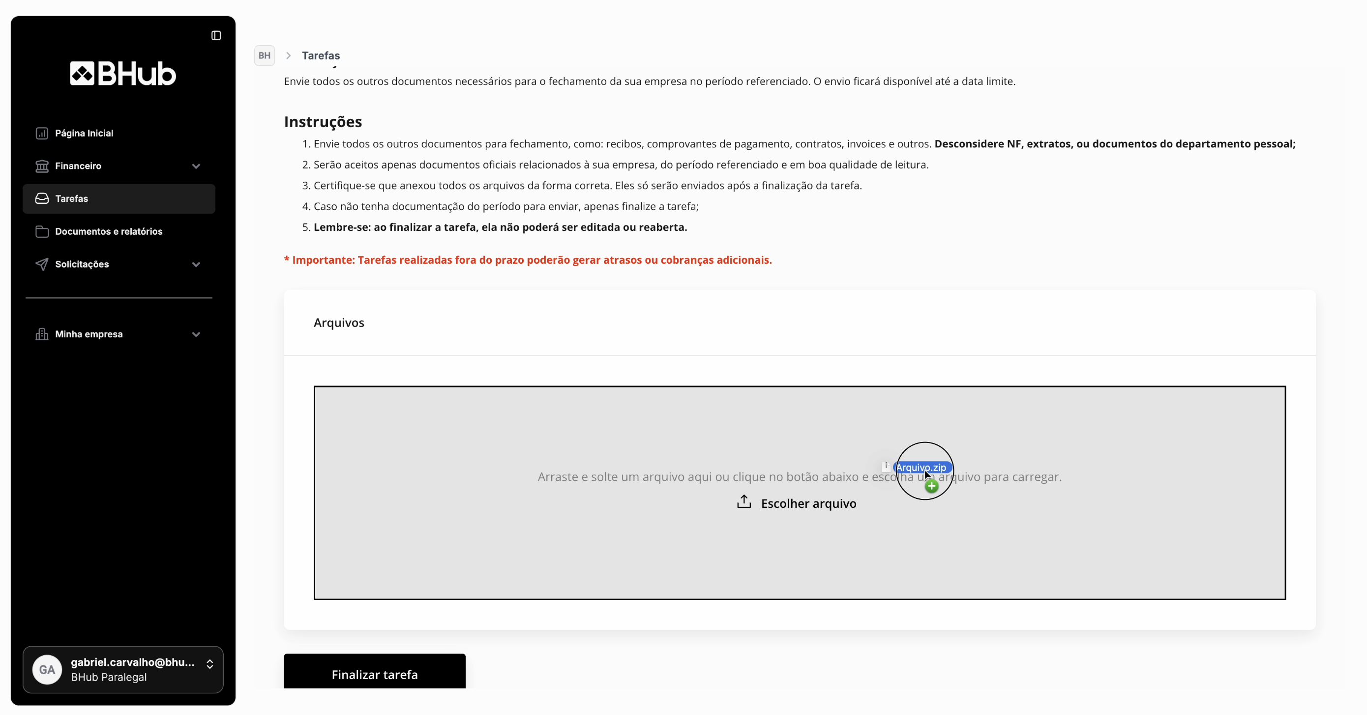 IMPORTANTE: Ainda que você comprima os documentos, privilegie arquivos em PDF e XML, pois eles facilitam os processamentos fiscal e contábil. Arquivos enviados dentro de planilhas dificultam a automatização de processos e requerem conferência manual, o que pode impactar em prazos e abrir brechas a erros.